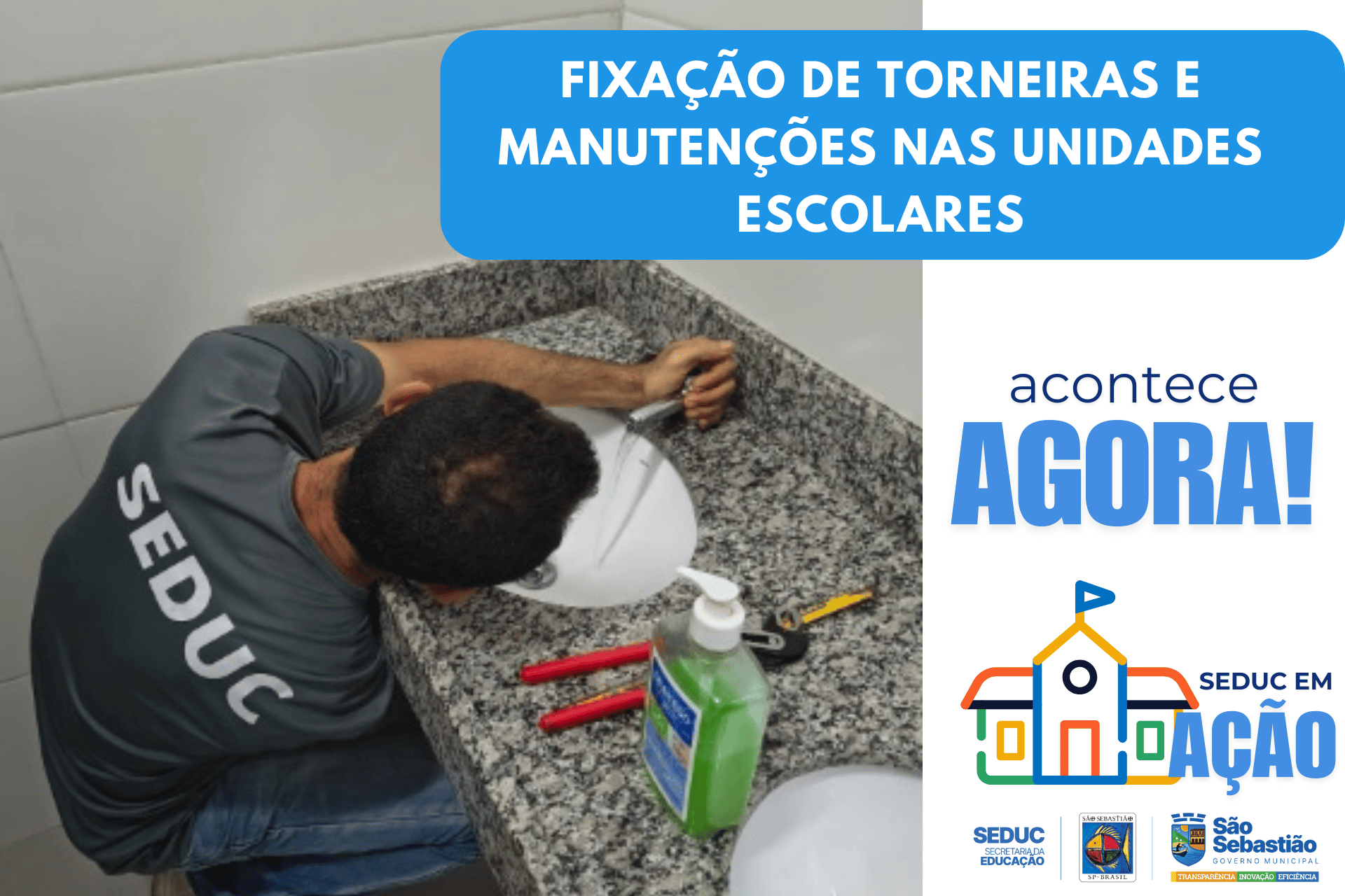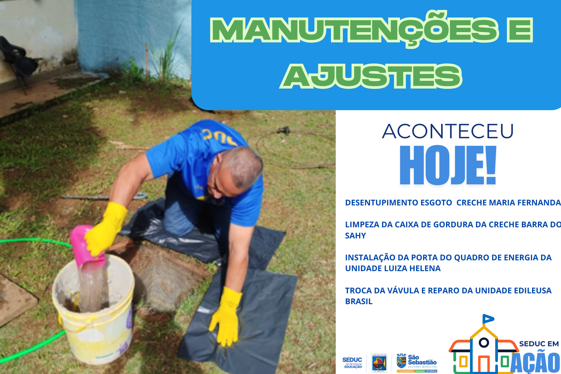 Reparo no vidro da sala de aula. Tampa da caixa de gordura refeita.Creche Maria Fernanda. Aplicação de PU na pia quebrada para parar vazamentoEMEI Peteleco Podas de arvores com o apoio da defesa civil Montão de Trigo Troca de torneira e instalação de porta papel… Chapeuzinho Vermelho