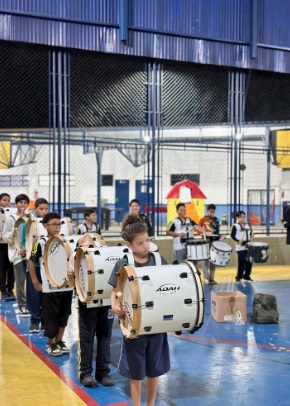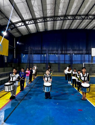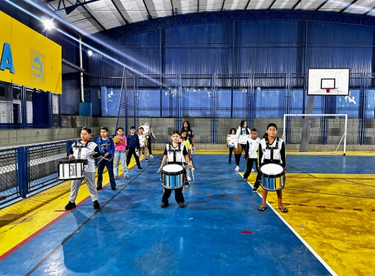 Ensaio dos alunos da E.M. Barrequeçaba, integrantes do corpo musical de percussão rudimentar da banda.