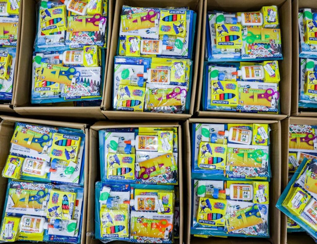 Entre os itens distribuídos estão apontador, borracha, cadernos nos formatos brochura, caligrafia, desenho, quadriculado e universitário, canetas, marca-texto, cola, compasso, esquadro, giz de cera, lápis de cor, lápis grafite, massa de modelar, papel sulfite, pasta com aba elástica, régua escolar, tesoura escolar e tesoura infantil, tinta guache, transferidor e estojo.