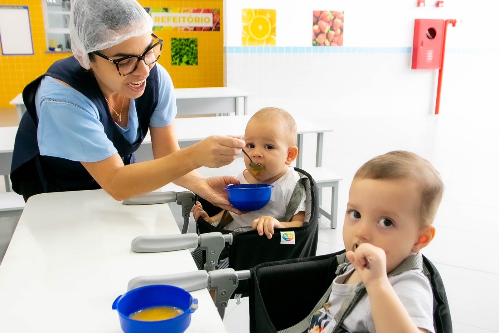 #PraTodosVerem: imagens mostram crianças da rede municipal de São Sebastião durante o momento da alimentação escolar. Em uma delas, um menino aparece com uma colher na mão, comendo sopa de uma tigela azul. Em outra, uma funcionária da escola alimenta um bebê com carinho, enquanto outro bebê também se alimenta sozinho. As últimas imagens mostram meninas uniformizadas comendo arroz, feijão e salada, sorrindo para a câmera. Fim da descrição.