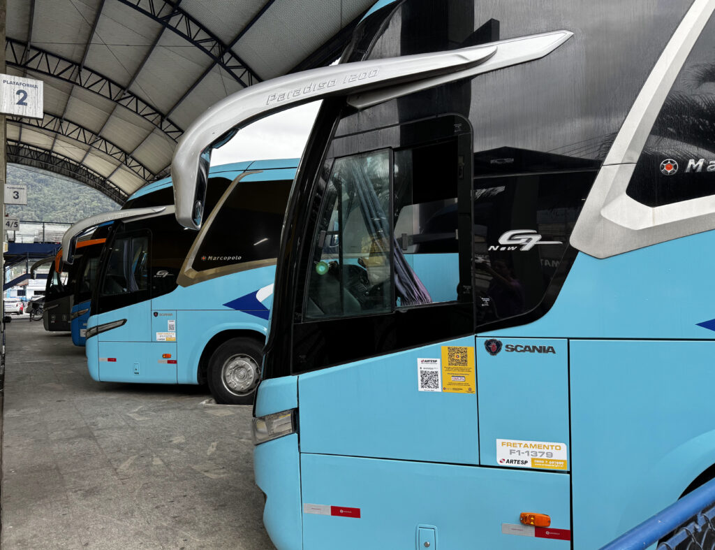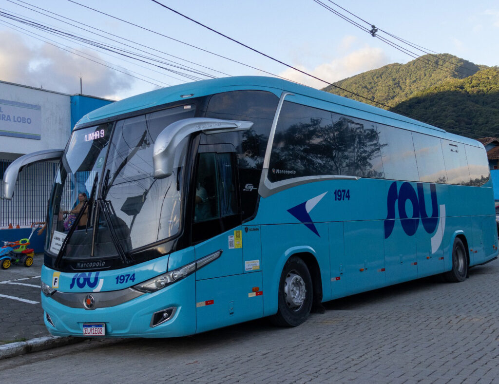 #PraTodosVerem: A primeira imagem mostra mãos segurando uma carteira de identificação do transporte universitário de São Sebastião para 2025; a segunda exibe uma fila de ônibus azul-claros da marca Scania estacionados em um terminal; e a terceira destaca um desses ônibus, com a logomarca “SOU” e o número 1974, parado em uma rua com montanhas verdes e céu ao fundo. Fim da descrição.