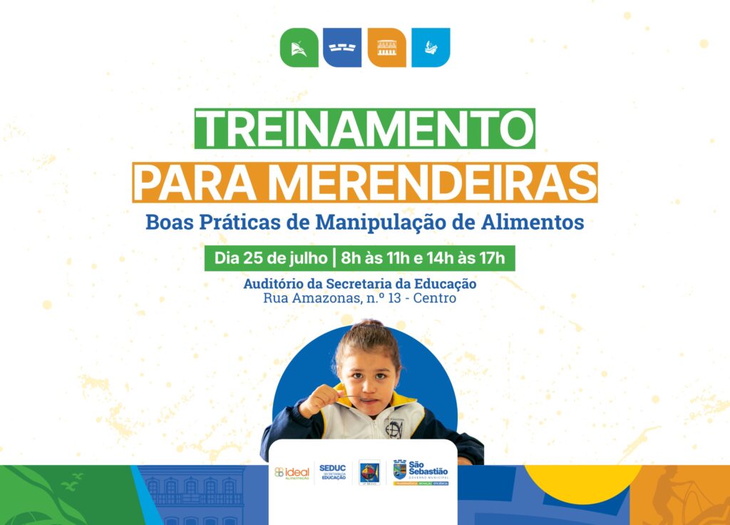 #PraTodosVerem: arte gráfica com fundo branco e detalhes de tinta em amarelo. No topo, ícones que representam elementos da cidade. Ao centro, lê-se: “TREINAMENTO PARA MERENDEIRAS – Boas Práticas de Manipulação de Alimentos”. Em destaque: “Dia 25 de julho | 8h às 14h e 14h às 17h”. Abaixo, o local: “Auditório da Secretaria da Educação – Rua Amazonas, n.º 13 – Centro”. Na parte inferior, logos da Ideal Alimentação, Seduc e Prefeitura de São Sebastião. Ao centro e embaixo, a foto de uma criança com uniforme escolar segurando uma colher. Em seguida, outra arte gráfica com fundo branco e verde. À esquerda, lê-se: “TREINAMENTO PARA MERENDEIRAS – Lei Lucas nº 13.722/2018”. Em destaque: “Dia 24 de julho – 8h e 14h”. Abaixo: “Auditório da Secretaria da Educação – Rua Amazonas, 13 – Centro”. À direita, imagem de um boneco de um bebê deitado com um adulto usando luvas de procedimento demonstrando uma manobra de primeiros socorros. Na parte inferior, logos da Ideal Alimentação, Seduc e Prefeitura de São Sebastião. Fim da descrição.