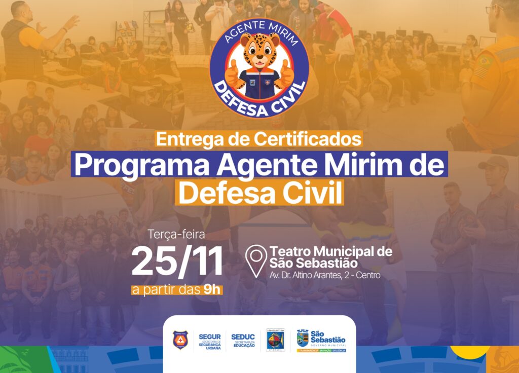 A Prefeitura de São Sebastião, por meio das secretarias da Educação (Seduc), da Segurança Urbana (Segur) e da Defesa Civil Municipal, realiza na próxima terça-feira (25/11) a cerimônia de formatura e entrega de certificados a 144 estudantes participantes do programa ‘Agente Mirim da Defesa Civil’. O evento será às 9h, no Teatro Municipal.
