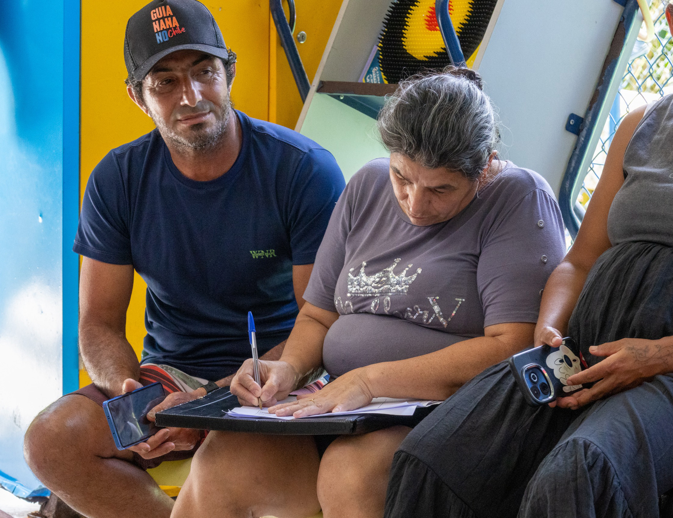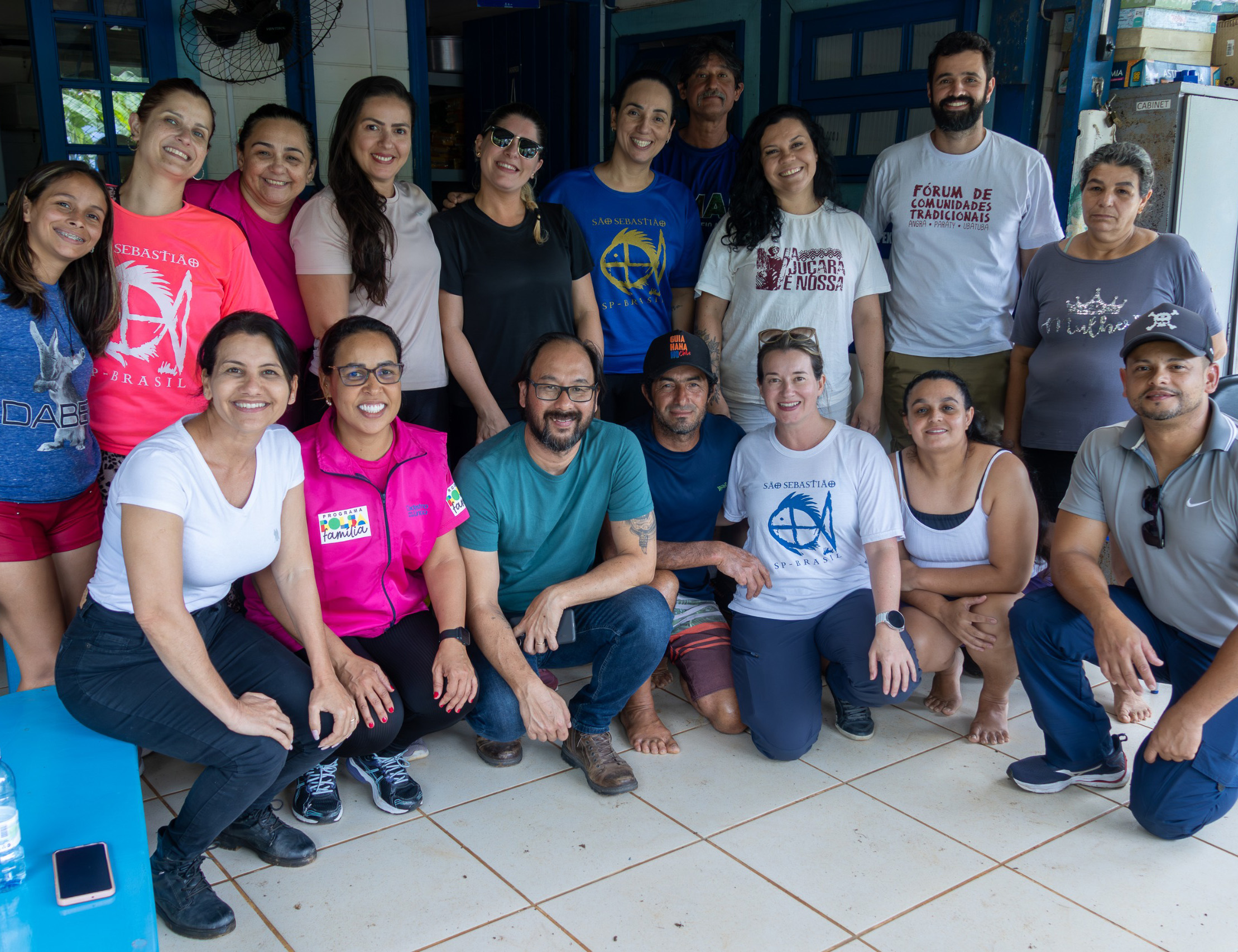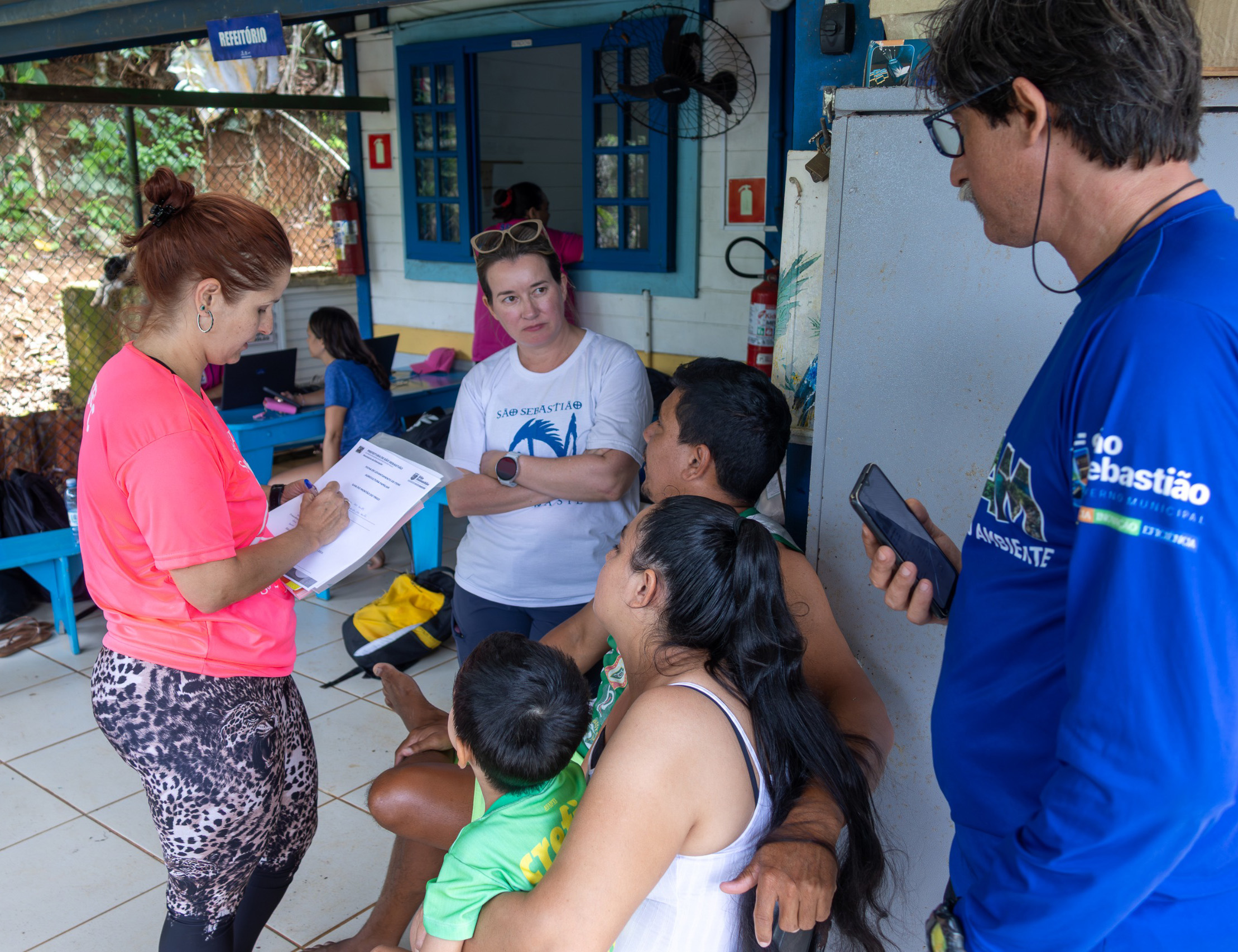 #PraTodosVerem: As quatro imagens documentam uma ação de atendimento e interação em um ambiente semiaberto ou externo. Três das imagens mostram atendimentos individuais ou familiares: pessoas sentadas ou em pé preenchendo ou assinando formulários, incluindo um documento da “PREFEITURA DE SÃO SEBASTIÃO”, com a presença de um homem de boné e funcionários da prefeitura, alguns usando camisetas com a estampa de São Sebastião. A quarta imagem é um retrato de grupo, onde aproximadamente quinze pessoas, sorridentes, estão reunidas e posando para a foto em um piso claro com azulejos. Fim da descrição.