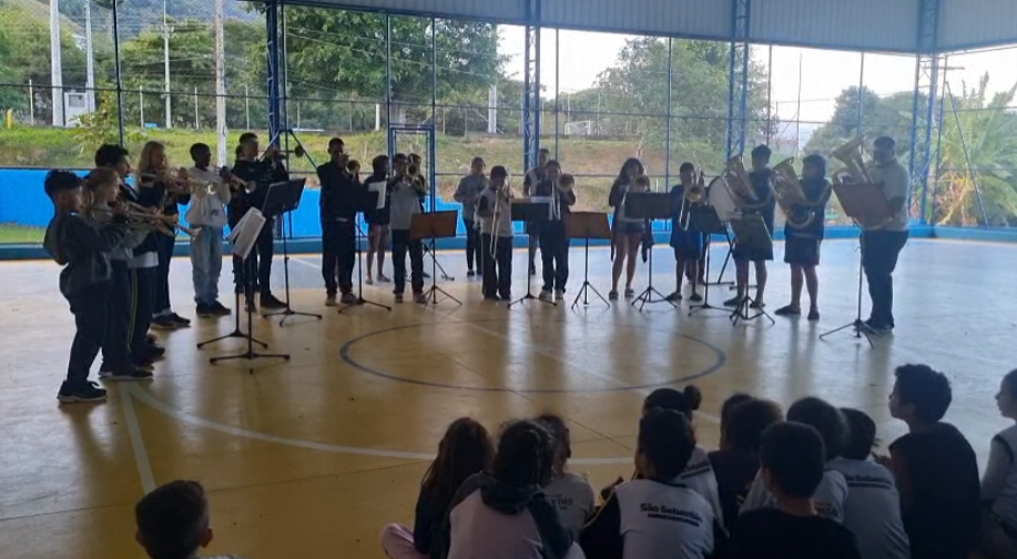 Alunos da própria Escola Walfrido, que participam do projeto, fizeram uma apresentação musical para suas turmas.