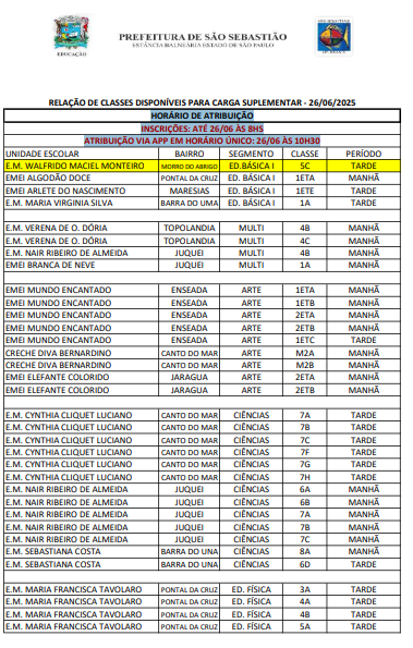 RELAÇÃO DE CLASSES DISPONÍVEIS PARA CARGA SUPLEMENTAR – 26/06/2025 Editais Sem categoria 25 de junho de 2025ludervan HORÁRIO DE ATRIBUIÇÃOINSCRIÇÕES: ATÉ 26/06 ÀS 8HSATRIBUIÇÃO VIA APP EM HORÁRIO ÚNICO: 26/06 ÀS 10H30