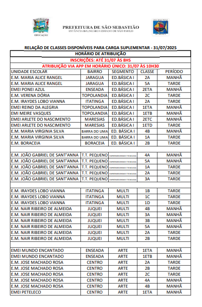 RELAÇÃO DE CLASSES DISPONÍVEIS PARA CARGA SUPLEMENTAR – 31/07/2025 Editais 30 de julho de 202530 de julho de 2025ludervan HORÁRIO DE ATRIBUIÇÃOINSCRIÇÕES: ATÉ 31/07 ÀS 8HSATRIBUIÇÃO VIA APP EM HORÁRIO ÚNICO: 31/07 ÀS 10H30