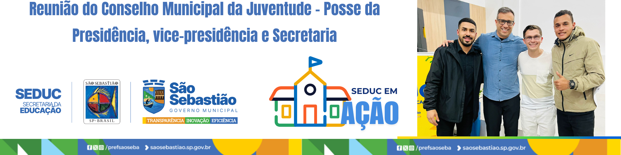 Na noite de ontem, no auditório da Secretaria Municipal de Educação de São Sebastião, foi realizada a eleição da nova mesa diretora do Conselho Municipal da Juventude. Em um processo democrático e representativo, Arquimedes Mota foi eleito presidente, Yago Franklin assumiu como vice-presidente, e Lucas Oliveira como secretário.