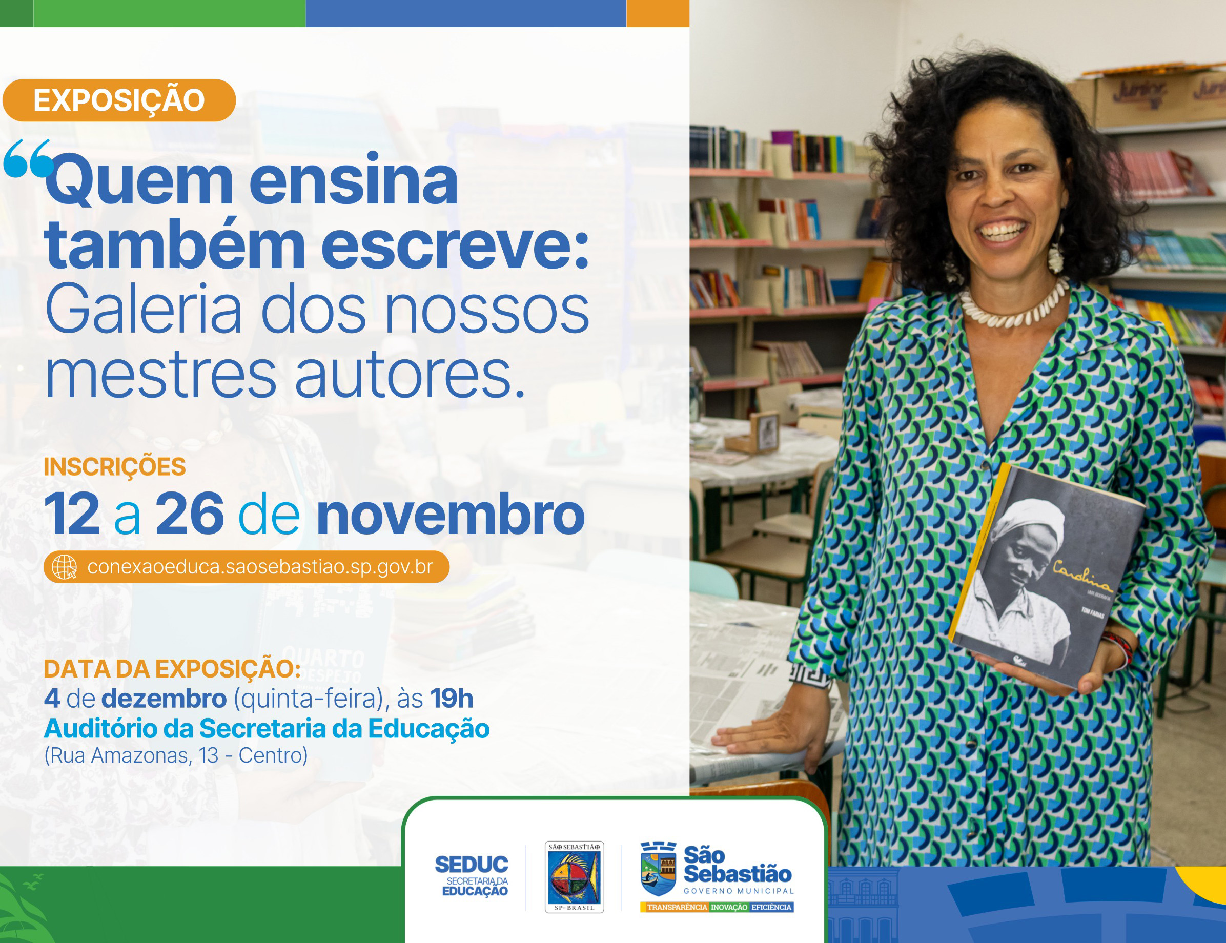 #PraTodosVerem: A imagem anuncia a EXPOSIÇÃO “Quem ensina também escreve: Galeria dos nossos mestres autores”, um evento da Secretaria da Educação de São Sebastião, com inscrições abertas de 12 a 26 de novembro pelo site conexaoeduca.saosebastiao.sp.gov.br; a data da exposição será no dia 4 de dezembro (quinta-feira), às 19h, no Auditório da Secretaria da Educação (Rua Amazonas, 13 – Centro), destacando uma mulher sorridente com cabelos cacheados segurando um livro com a foto de Carolina Maria de Jesus na capa. Fim da descrição.